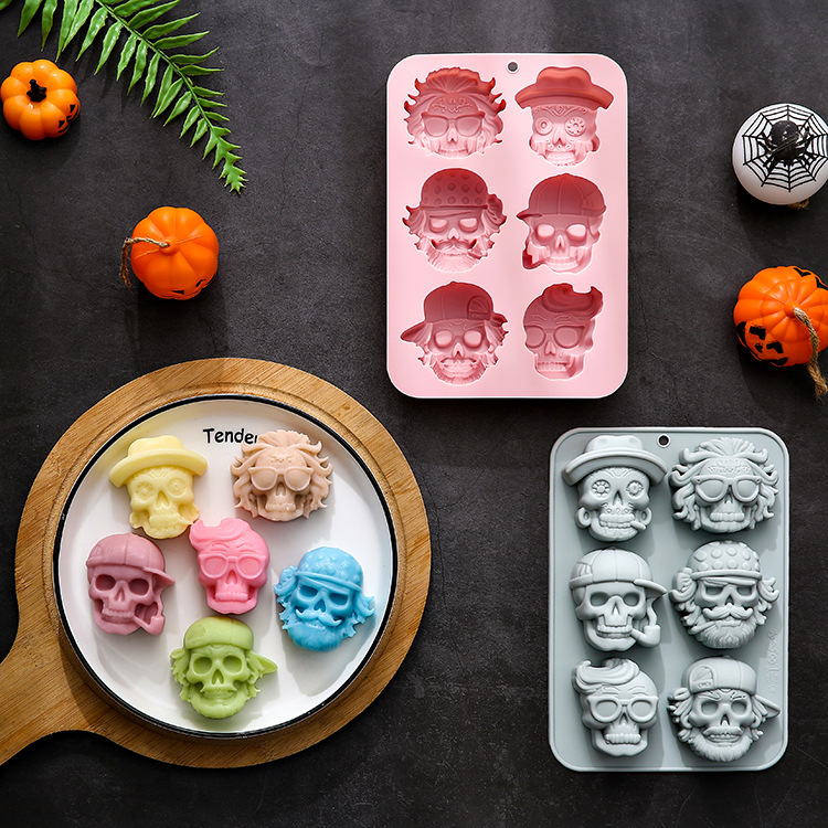 現物6連6種類の異なるスタイルのスカルの形のシリカゲルの金型のハロウィンの日のケーキの鋳型の氷の鋳型
