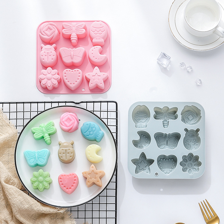 現物9連月甲虫トンボ蝶などの異なる造形チョコレート型シリコンケーキ型滴金型