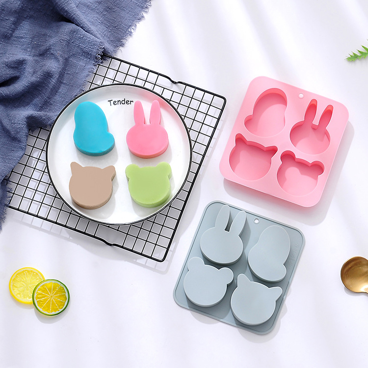 現物4連の異なるアニメ動物の造形シリカゲル金型手作り石けん菓子パンケーキ金型滴ゴム金型