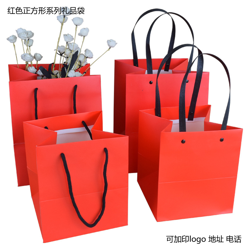 赤い紙袋の正方形のケーキのギフトバッグの手提げ袋の果物の包装袋の花の盆栽の外売り袋の印字