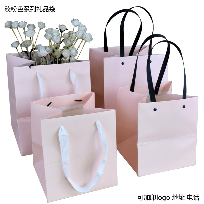 正方形の淡いピンクのギフト袋クラフト紙袋の出前包装手提げ袋の花の誕生日プレゼント包装袋