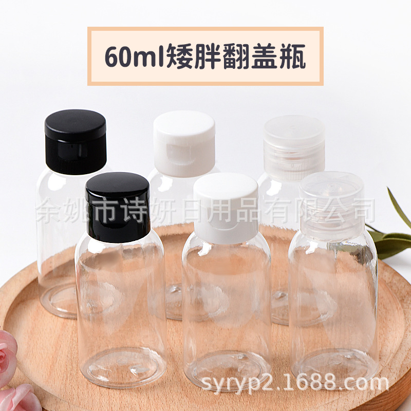 バッチ60mlミリリットルの低太ったPETペットボトルに24-410口径の蝶蓋をつけて、乳液を入れて、サンプルボトルを分けます