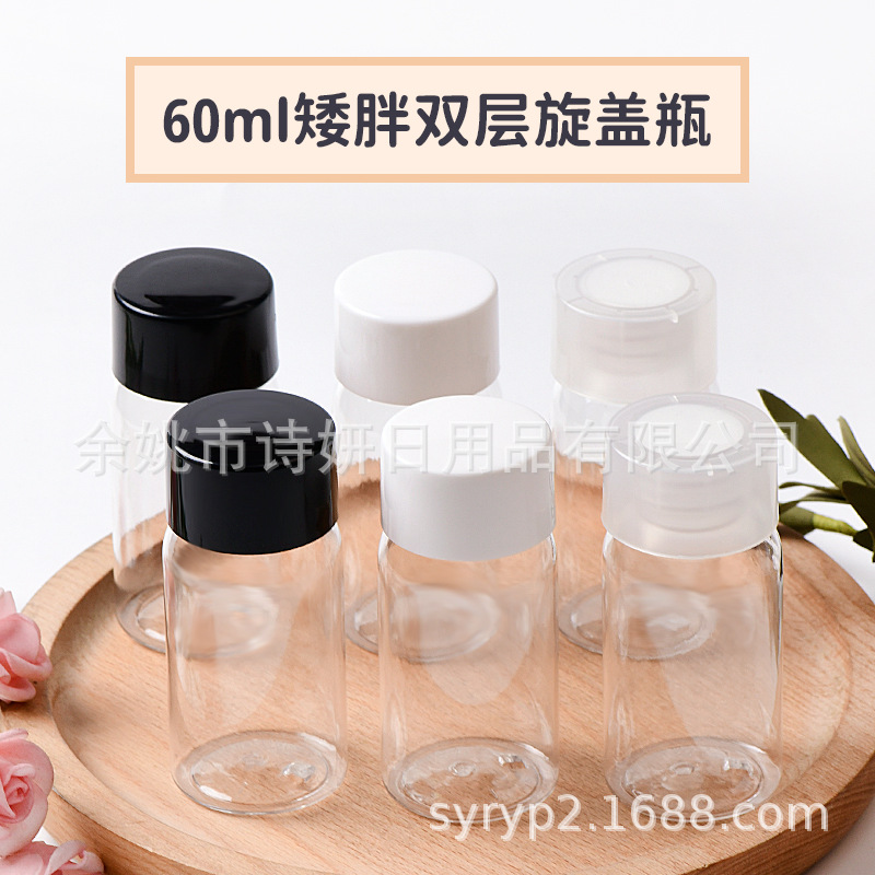 ロット60mlの低い太った24口径PET二重の蓋のプラスチックの分注の瓶の大きい蓋は内栓の乳液の瓶の包装材を持ちます。