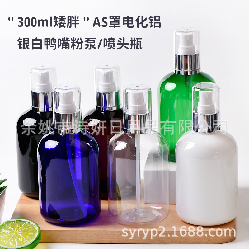 300mlの低い太った瓶と24歯のアヒルの口の粉のポンプの乳液は瓶のPETのプラスチックの瓶の化粧品を押して乳液の瓶を分けます。