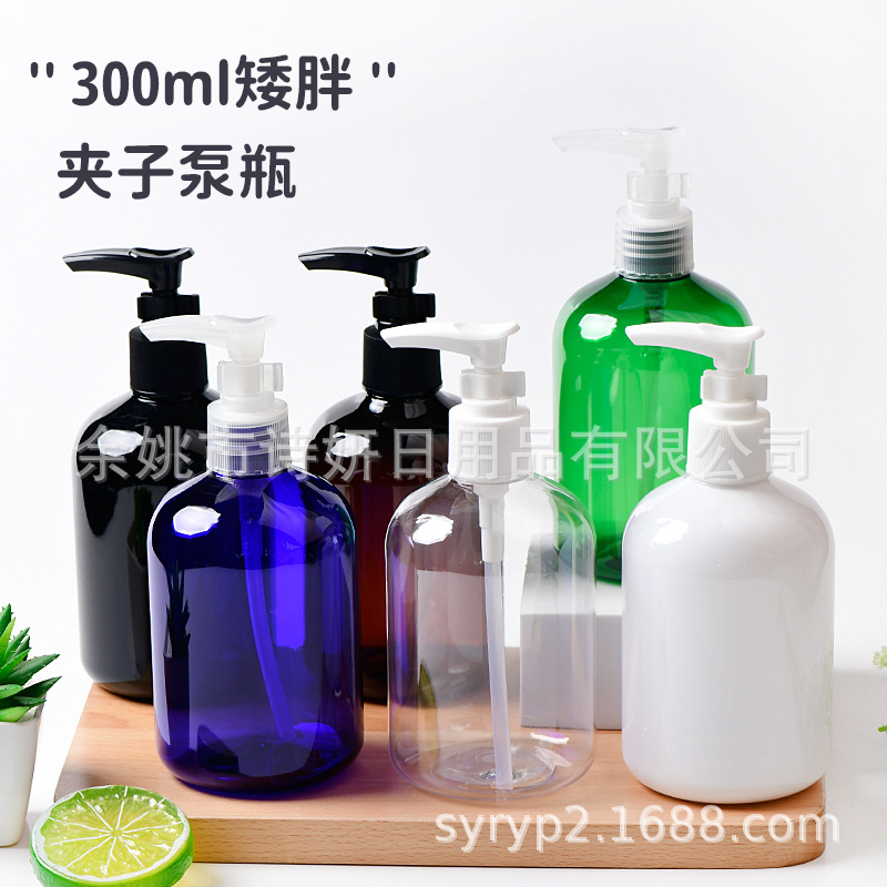 卸売り300mlの低い太った丸い肩の瓶24口径のクリップポンプの乳液はポンプPET化粧品を押して瓶を分けます。