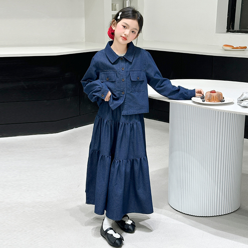 女の子の春と秋のドレスセット 2025 新しい子供スタイルのデニムスカート大きな子供のファッショナブルなサスペンダースカート