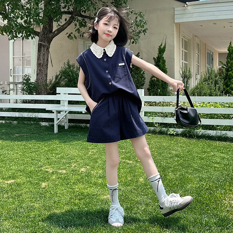 女の子洋風スーツ2025夏新作韓国風おしゃれラペルノースリーブシャツとショーツ中大子供用2点セット