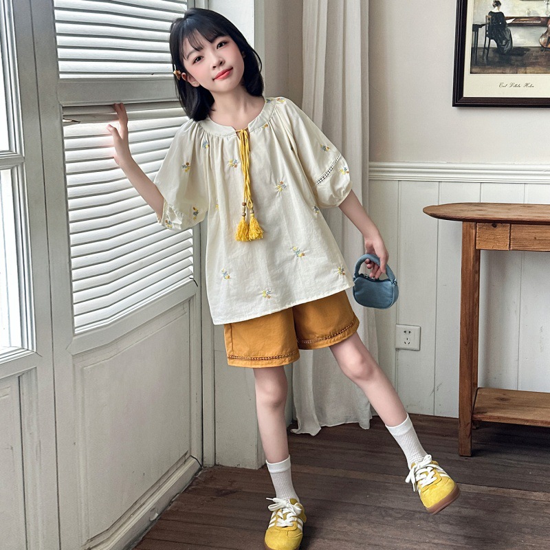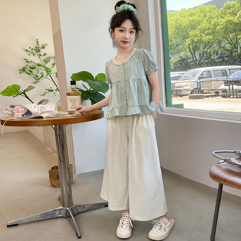 女の子洋風スーツ2025夏新作韓国風スウィートベビードールシャツ中大子供用半袖ワイドパンツ2点セット