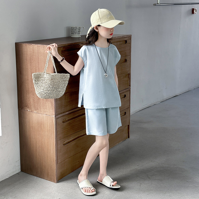 女の子のクールなノースリーブコットンとリネンスーツ2025新しい夏スタイル中型と大型の子供用肌に優しい通気性のあるベストとショーツの2点セット