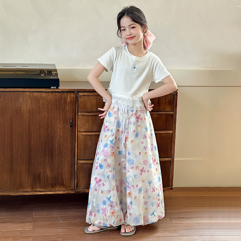 女の子のスタイリッシュで甘いスーツ 2025 夏の新しい大きな子供の韓国レース半袖花柄ルーズバドパンツスーツ