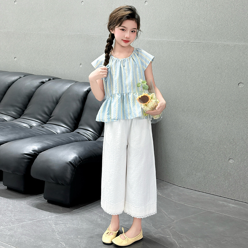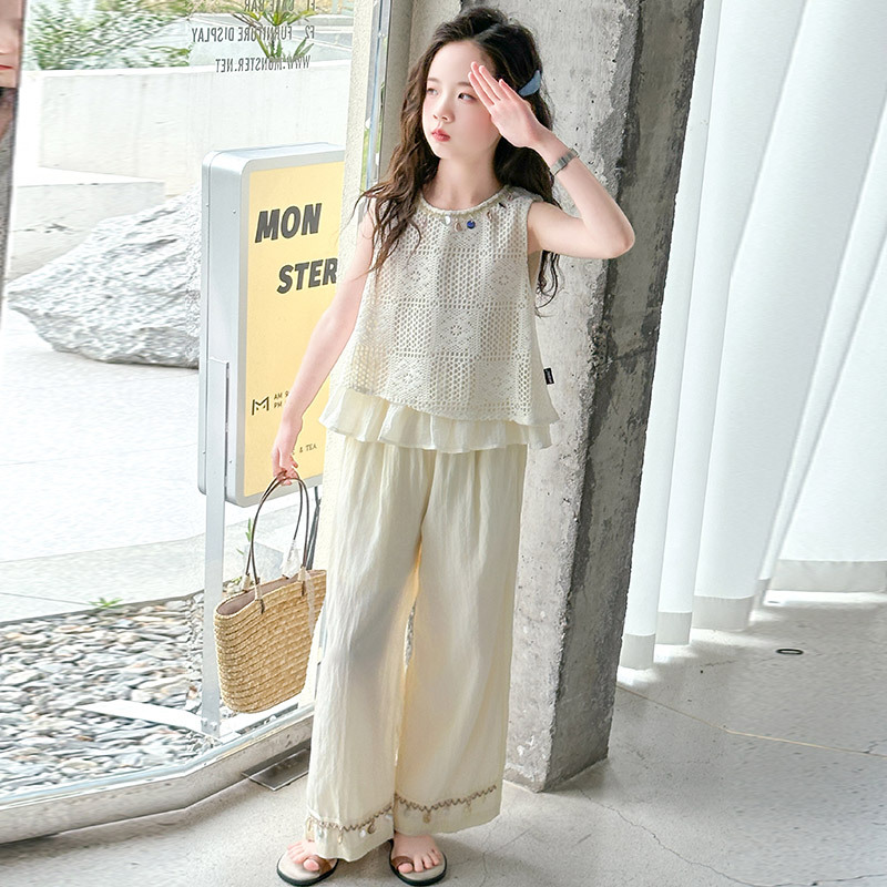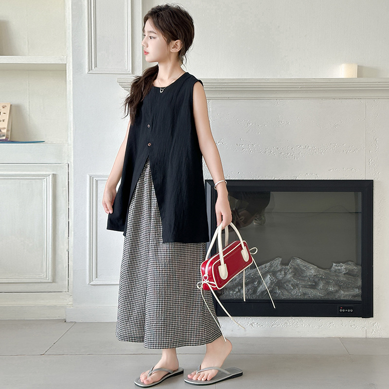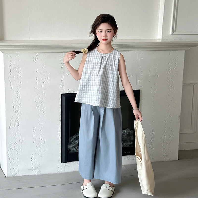 女の子ベストセット 2025 夏新作韓国風おしゃれトップスチェック柄ワイドレッグパンツ大きい子供用 2 点セット