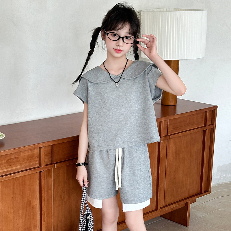 ガールズカレッジスタイルカジュアルスーツ2025夏新作韓国風ネイビーカラー半袖ショーツ2点セット年長児用