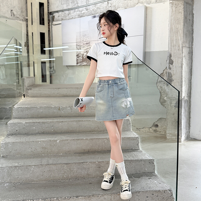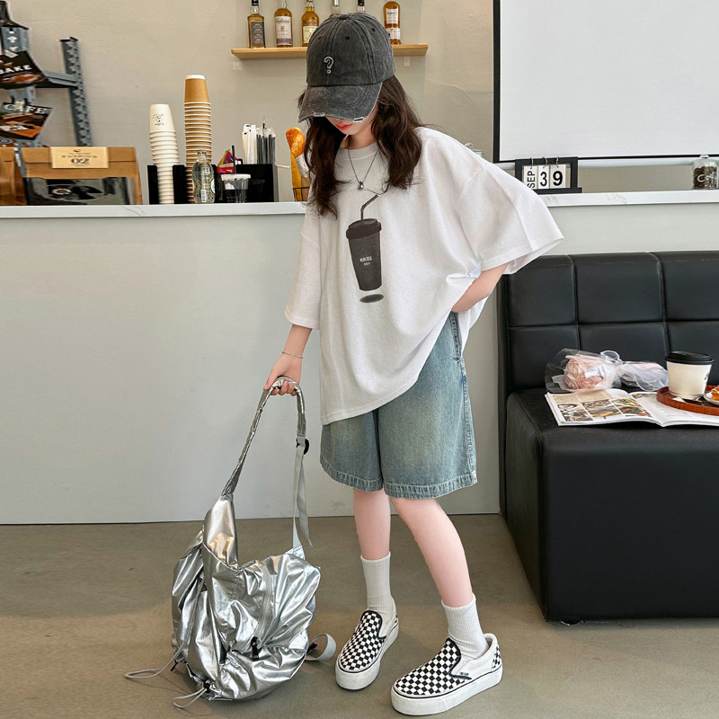 女の子スーツ半袖ショーツ2025新しいスタイル大きな子供女の子夏デニムミッドパンツファッショナブルな2点セット
