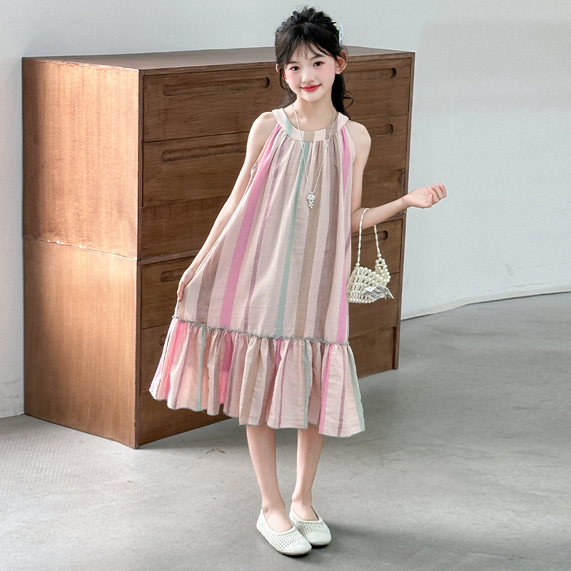 女の子ホルターネックドレス 2025 夏の新しいスタイルビッグ子供の休暇スタイルサスペンダースカートファッショナブルなビーチスカートプリンセスドレス