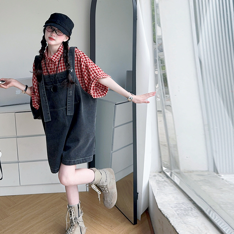 女の子オーバーオールスーツ 2025 夏の新スタイル韓国風ファッショナブルな半袖チェック柄シャツショーツ 2 点セット