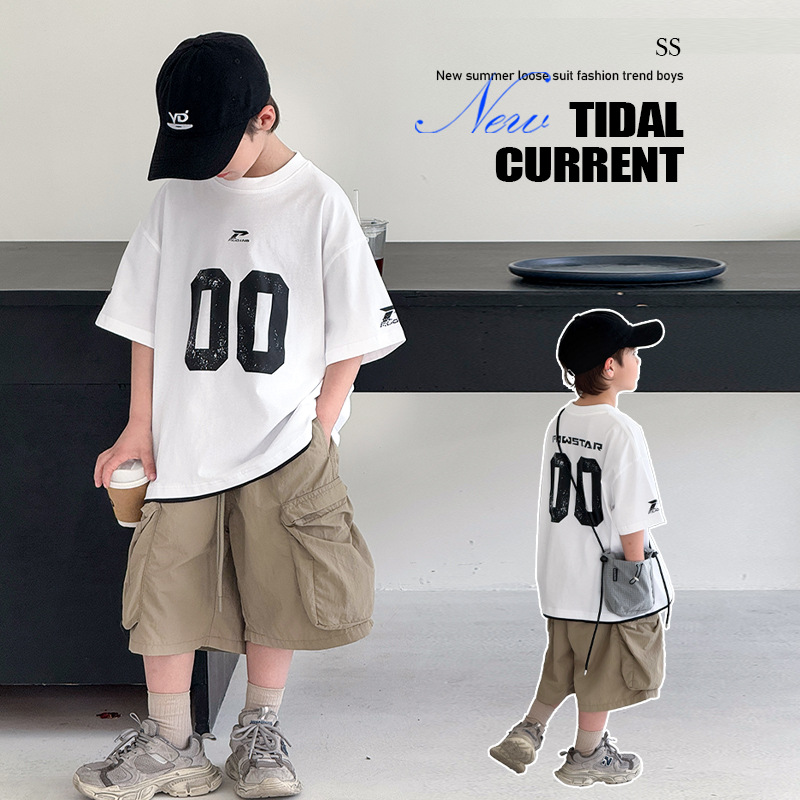 ボーイズスーツ 2025 新しい中型および大型子供用ファッショナブルなカジュアルスタイル半袖作業服ミッドパンツクールサマースーツ 2 点セット