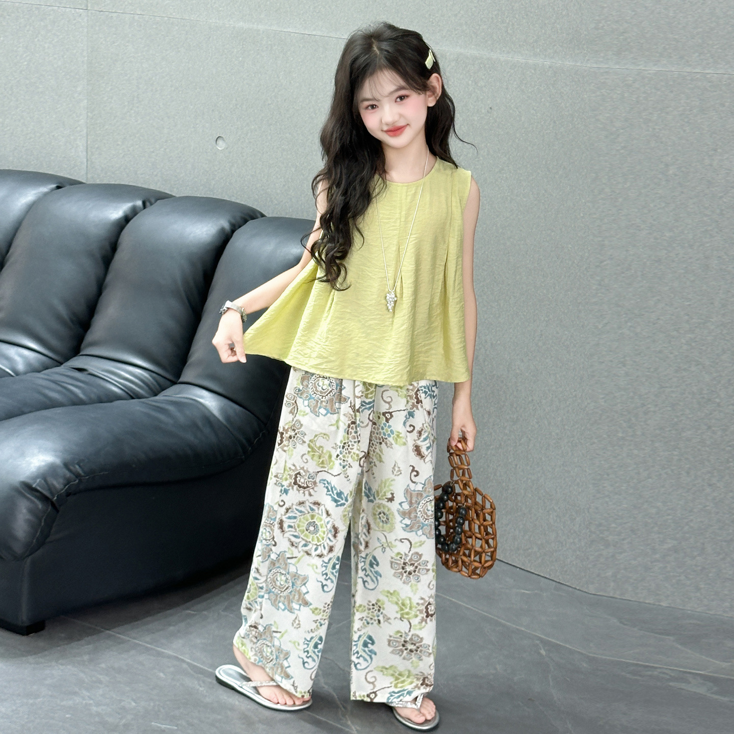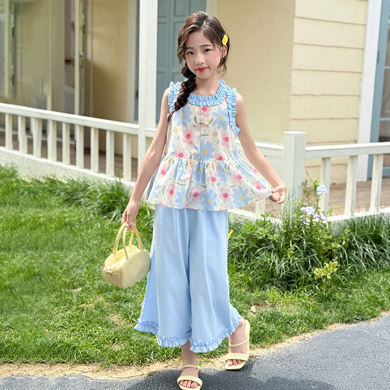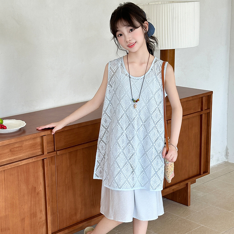 女の子の涼しい夏服 2025 新しい大きな子供のファッショナブルなスタイルのレースフラワーベストワイドレッグパンツツーピーススイートセット