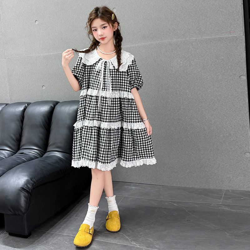 女の子ドレス 2025 夏新作韓国風かわいい人形襟半袖チェック柄スカートレースケーキスカート