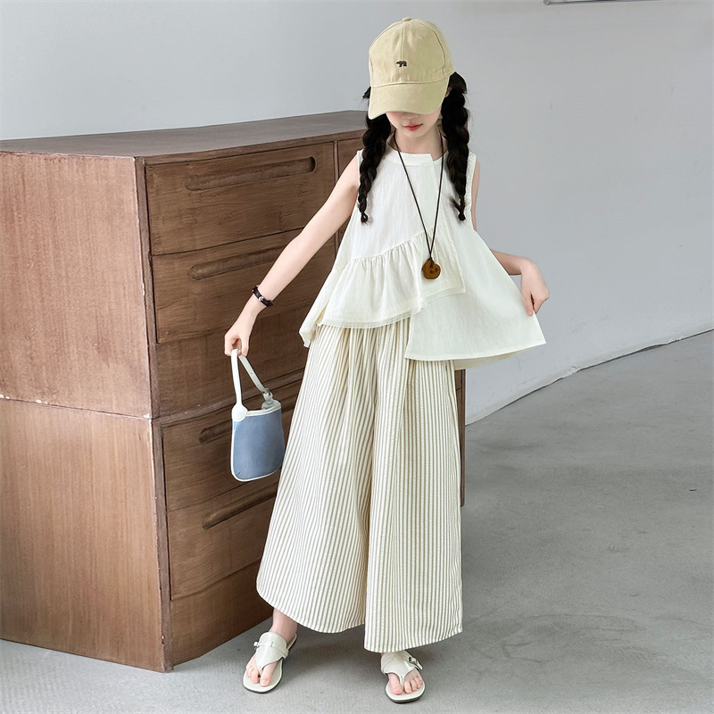 女の子クールスーツ2025夏新作大きい子供用おしゃれ不規則ベストストライプワイドレッグパンツ2点セット