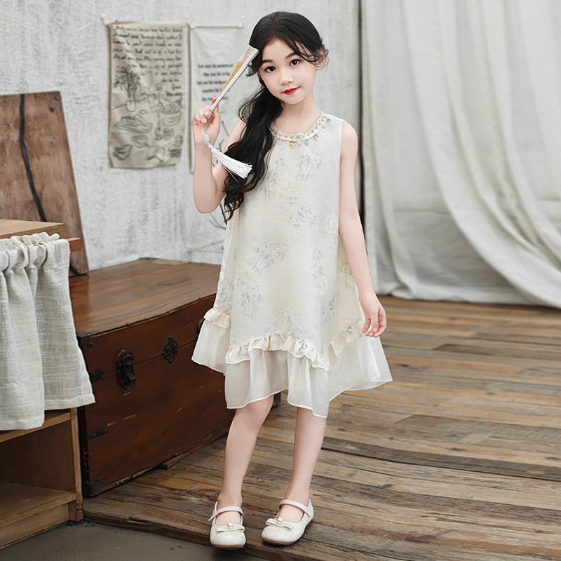 女の子の中国風ドレス 2025 夏の新しい大きな子供のクールなノースリーブベストドレスレースステッチアンティークスタイルスカート