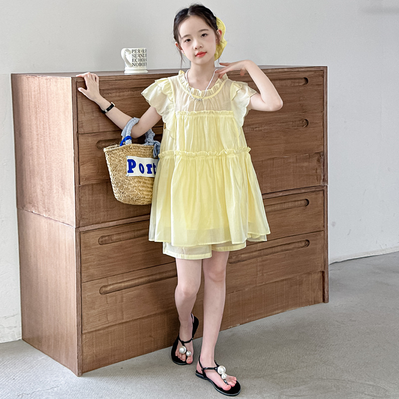 女の子のおしゃれなフライングスリーブベビードールスーツ2025新しい大きな子供用韓国風ファッショナブルで甘いベストショーツ2点セット