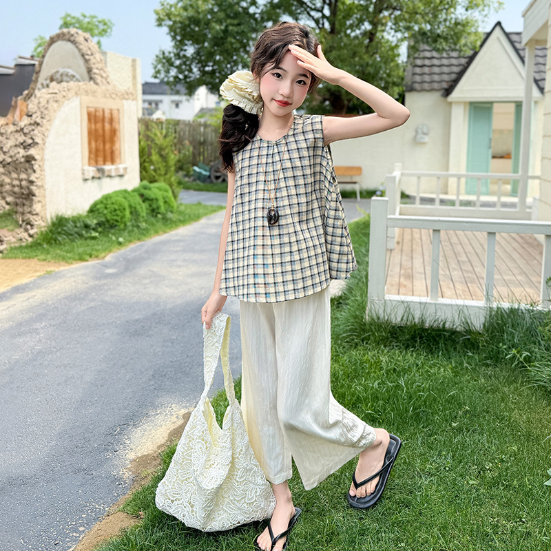 女の子カジュアルクールサマースーツ2025新しい大きな子供韓国風西洋スタイルチェック柄ノースリーブベストワイドレッグパンツトレンディ