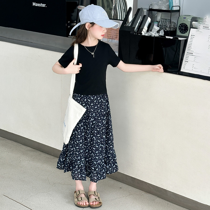 女の子韓国風フレッシュスーツ2025夏新作大きい子供用おしゃれ半袖花柄スカート2点セット