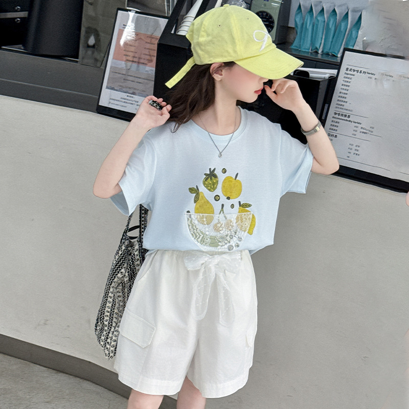 女の子韓国カジュアルスーツ2025夏新作韓国風おしゃれ半袖ショーツ大きい子供用涼しく薄い2点セット