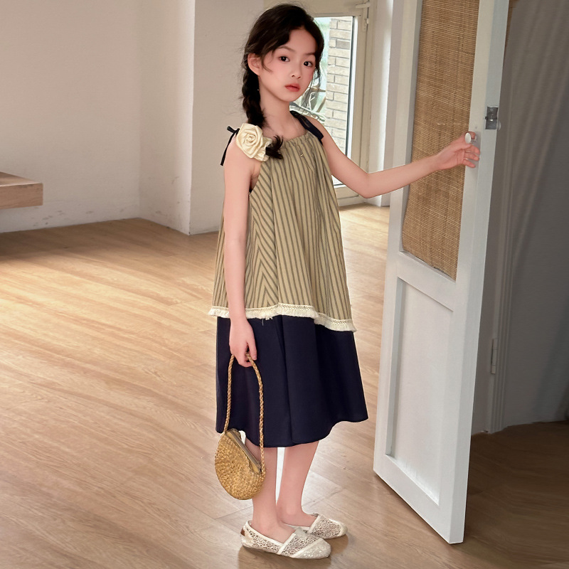 女の子ノースリーブドレス2025夏新作ビッグ子供用トレンディサスペンダースカート中空ベストスカートツーピーストレンディセット