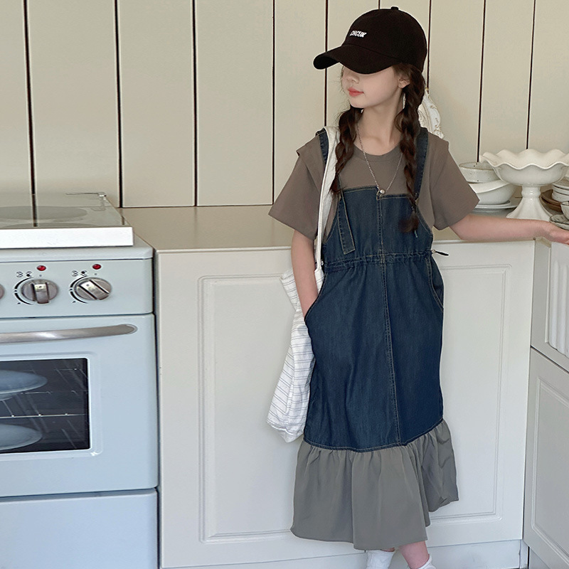 女の子ドレス 2025 夏の新スタイル大きな子供半袖デニムステッチ偽ツーピースサスペンダースカート女の子の夏のドレス