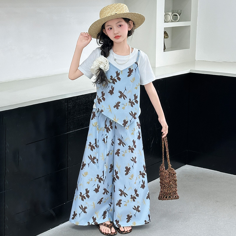 女の子洋風スーツ2025夏新作ビッグ子供ネットセレブ休暇風偽ツーピース半袖ワイドレッグパンツ2点セット
