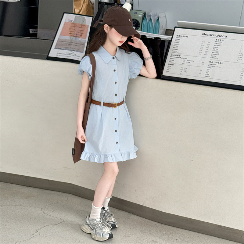 女の子のシャツスカートサマードレス 2025 新しい子供のファッショナブルなパフスリーブカーディガンスカートカレッジスタイルウエストドレス