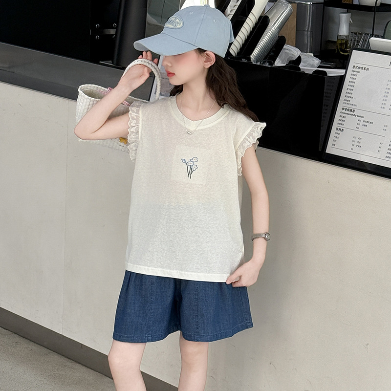 女の子のおしゃれなフライングスリーブスーツ2025夏新作ビッグ子供クールノースリーブベストデニムショートパンツ2点セットトレンディ