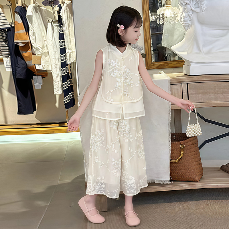 女の子の新しい中国風のサマースーツ 2025 新しい大きな子供の中国風のレトロなノースリーブトップワイドレッグパンツツーピーストレンディセット