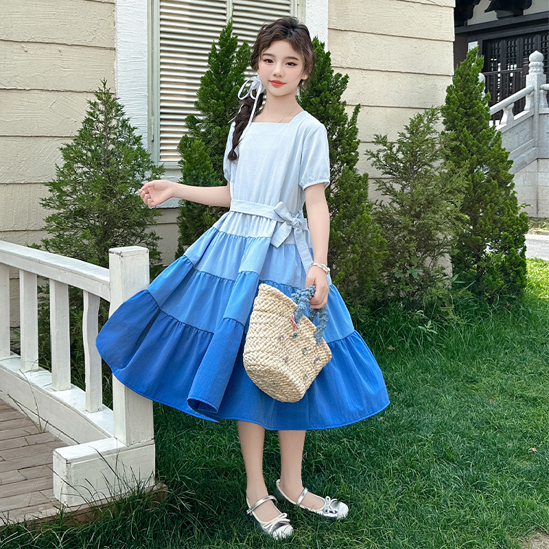 女の子のグラデーションカラードレス 2025 夏の新しいスタイルの大きな子供のファッショナブルな半袖スカートファッショナブルなスプライシングプリンセススカートトレンディ