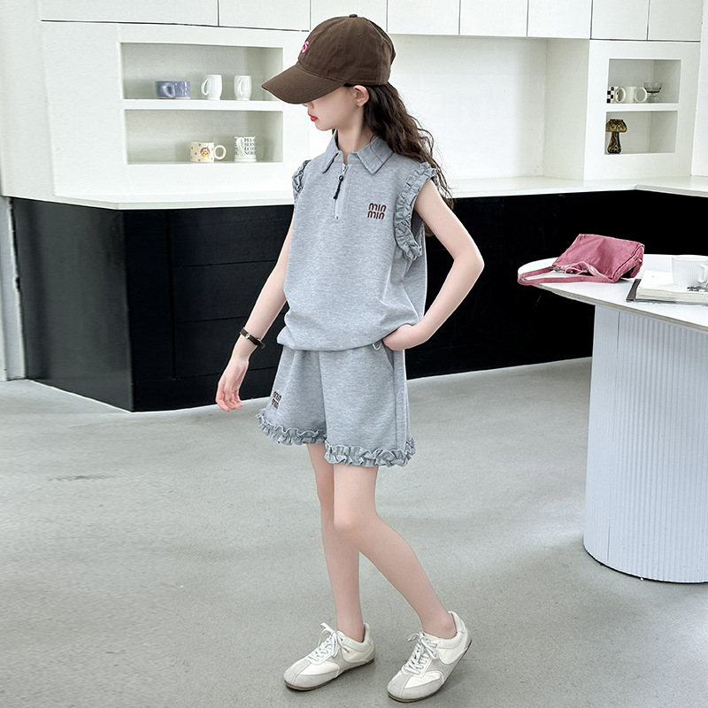 女の子カジュアルスーツ 2025 夏の新スタイル大きな子供のノースリーブポロベストショーツレースクール服 2 点セット