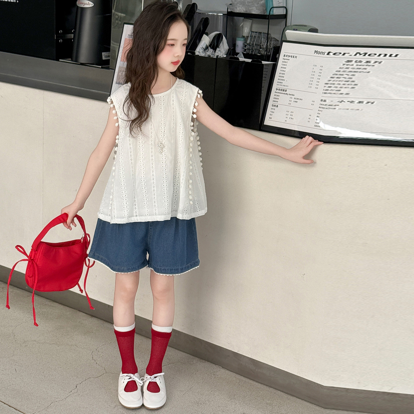 女の子ノースリーブベストスーツ 2025 新しい夏スタイル大きな子供中空トップデニムショートパンツクールな夏のツーピーススーツ