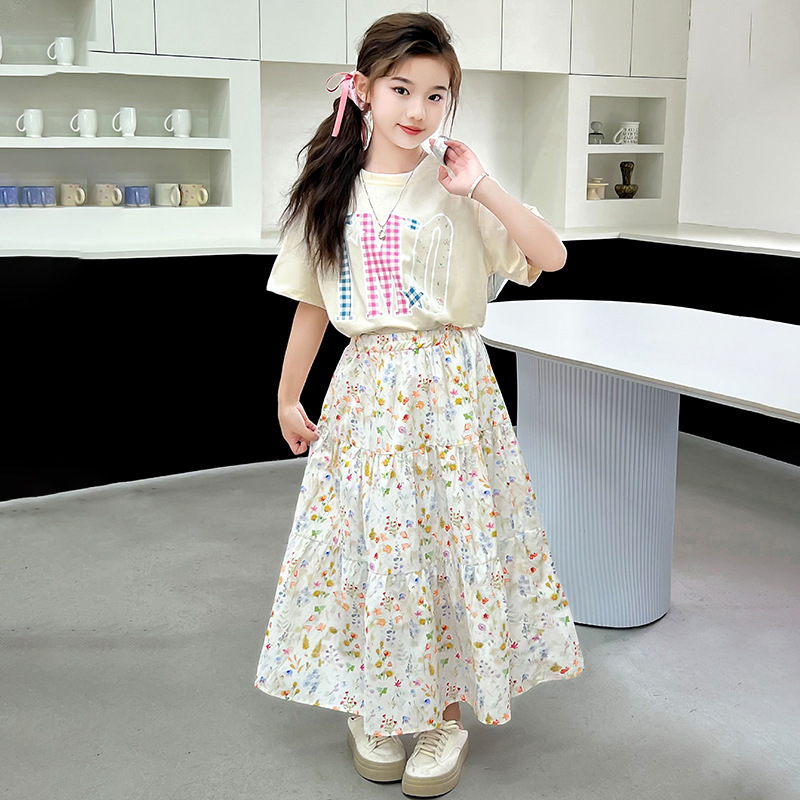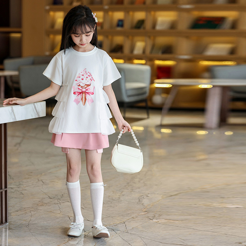 女の子スカートスーツ2025夏新作中大型子供韓国半袖Tシャツリボンスカート2点セット