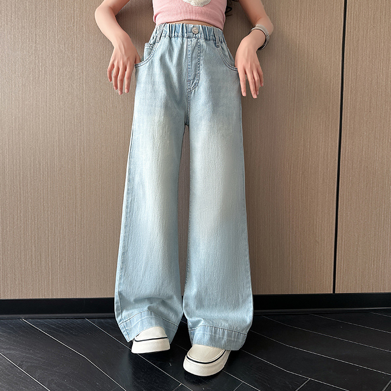 女の子の夏のトレンディな薄いテンセルジーンズ 2025 新しい大きな子供のファッショナブルなカジュアル多用途ワイドレッグパンツ