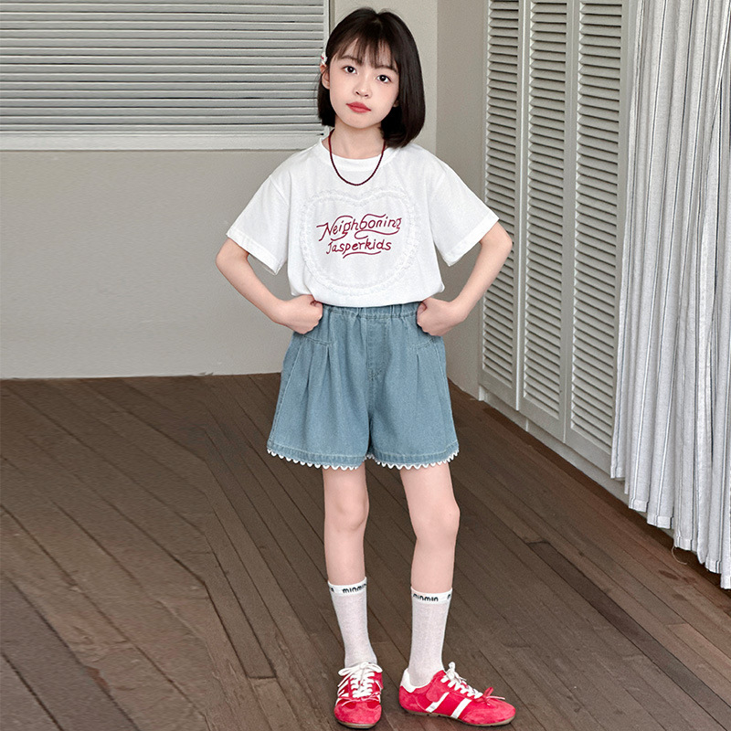 女の子サマースーツ2025新作韓国風外国風シンプル半袖レースデニムショートパンツ2点セット大きい子供用