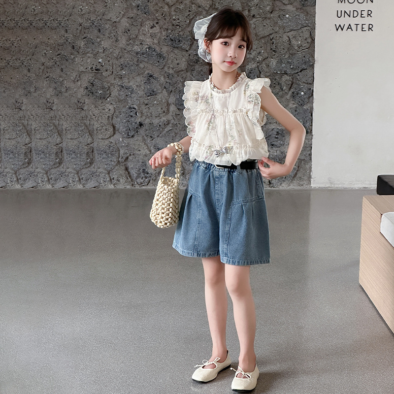女の子の洋風スーツ 2025 夏の新スタイル大きな子供のレースシャツノースリーブベストデニムショーツツーピーストレンディセット