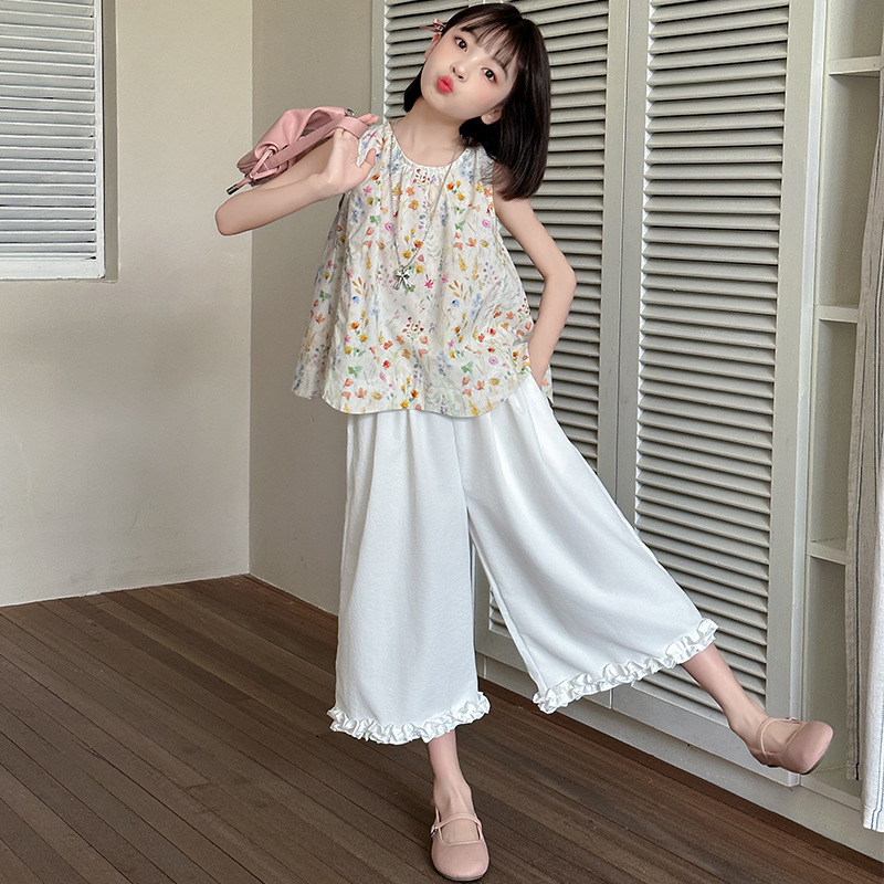 女の子ノースリーブ花柄ベストスーツ 2025 夏新作韓国風クールサマーカプリパンツ 2 点セット