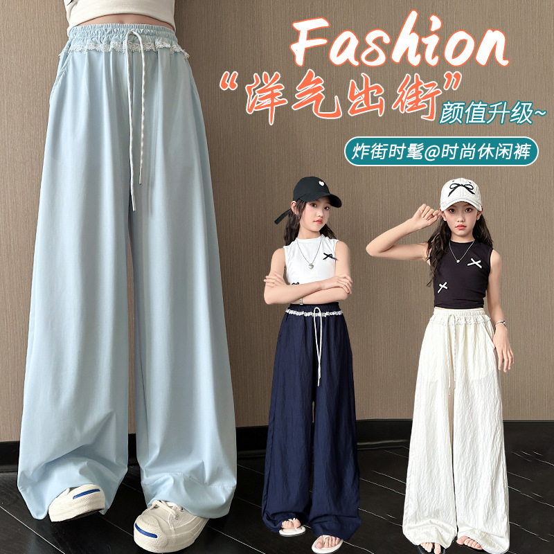 女の子の涼しい夏の氷のようなカジュアルパンツ 2025 新しい大きな子供のファッショナブルな西洋スタイルのレース速乾性防蚊パンツズボン