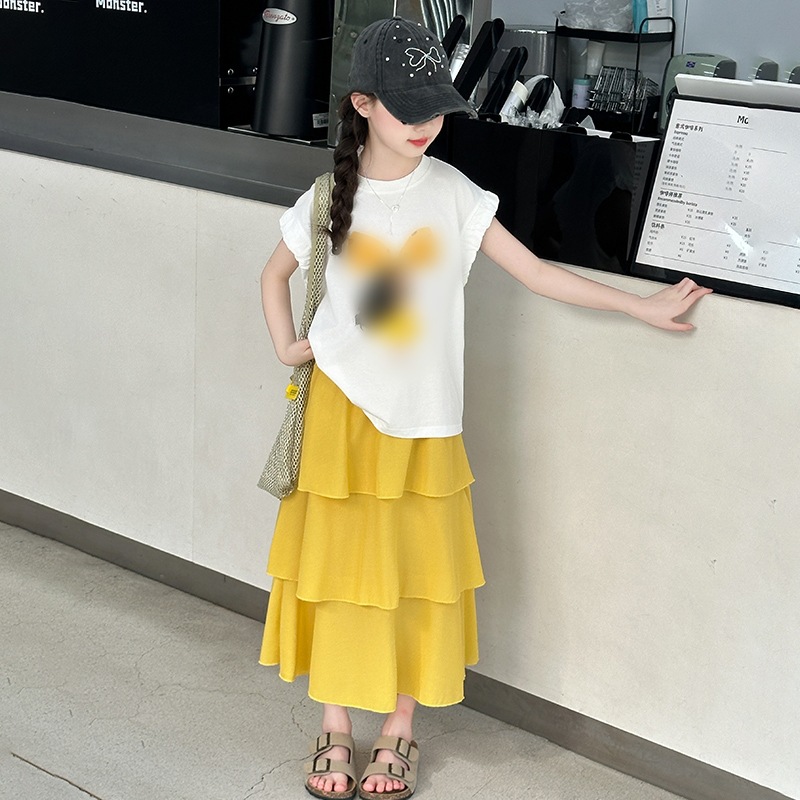 女の子のおしゃれで涼しいサマースーツ2025新作大きい子供用ノースリーブベストTシャツケーキスカートとスカートの2点セット