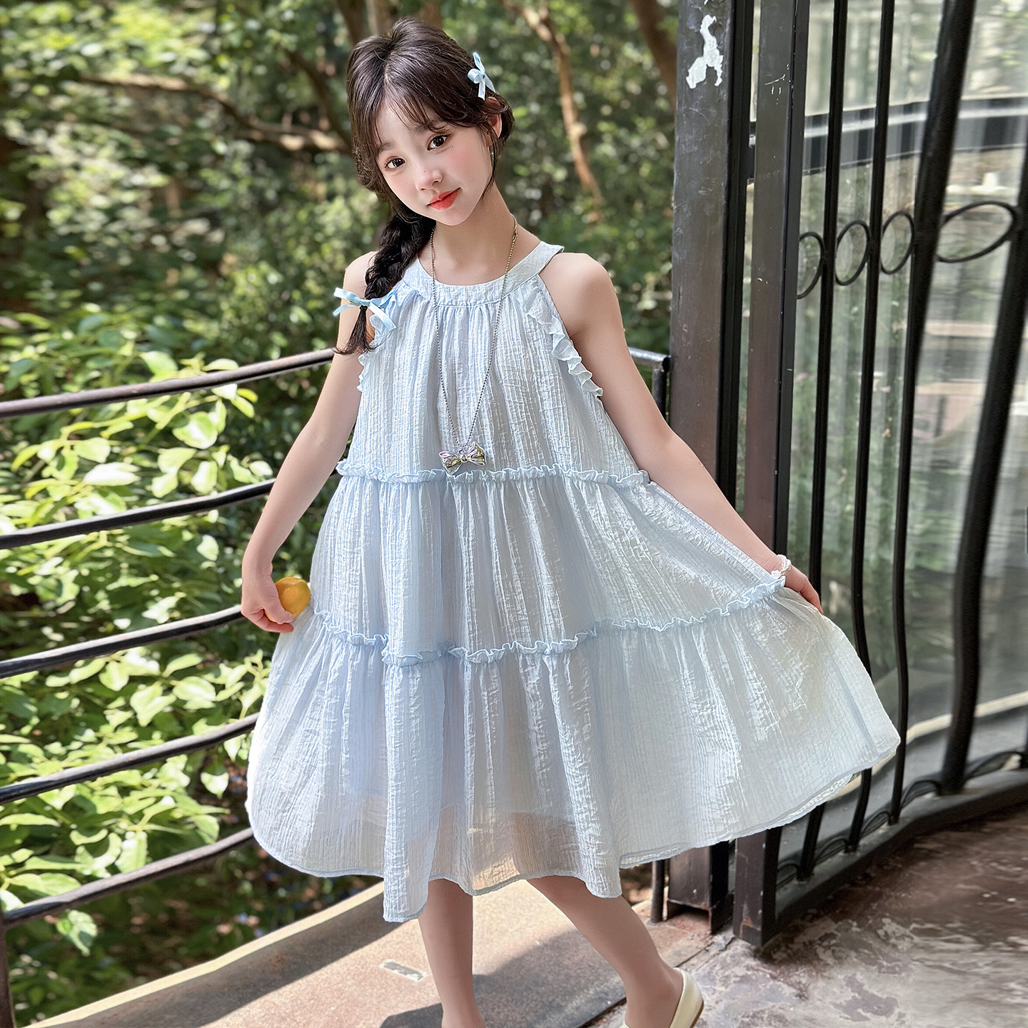 女の子クールノースリーブドレス 2025 夏新ビッグ子供韓国スタイルファッショナブルなホリデースタイルベストドレスプリンセスドレス