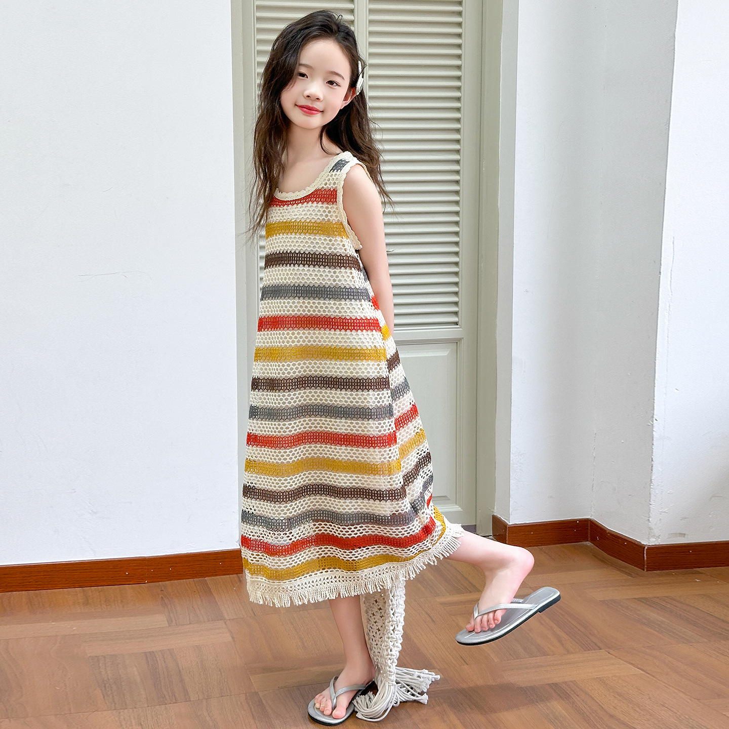 女の子の夏のノースリーブドレス 2025 新しい大きな子供のカラフルなストライプのベストドレスロングメッシュ中空スカート