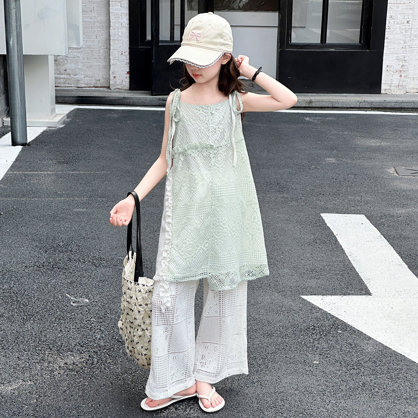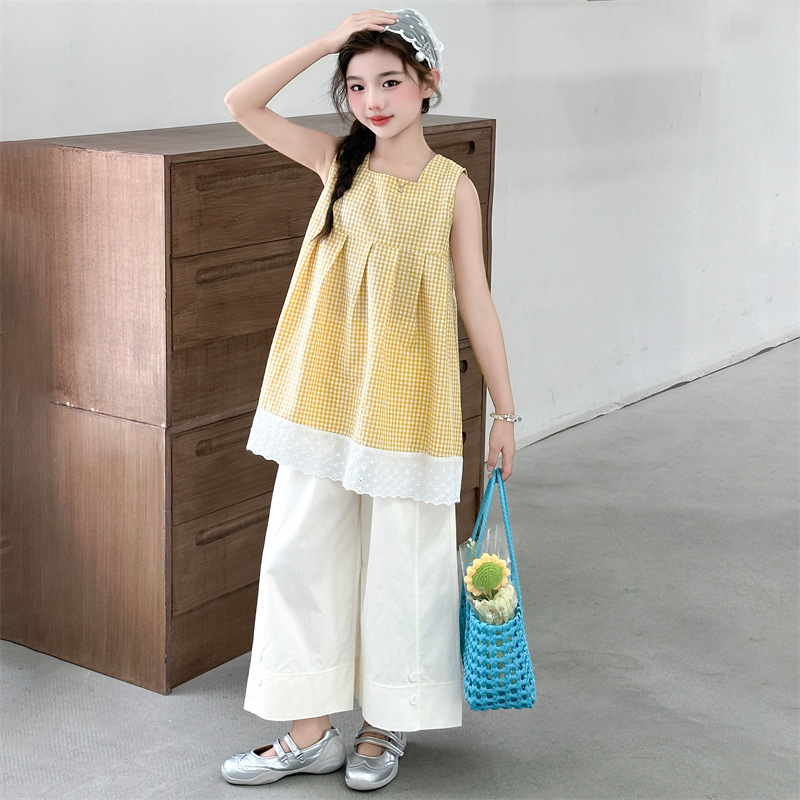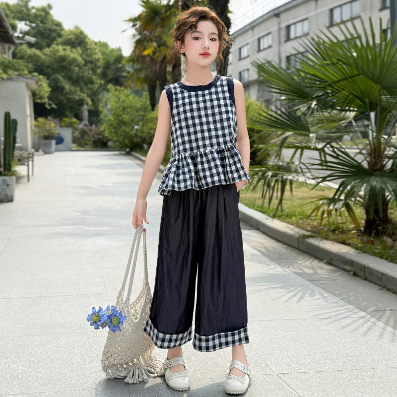 女の子韓国甘いサマースーツ 2025 新しい大きな子供のファッショナブルなスタイルのチェック柄ベストワイドレッグパンツ 2 点セット