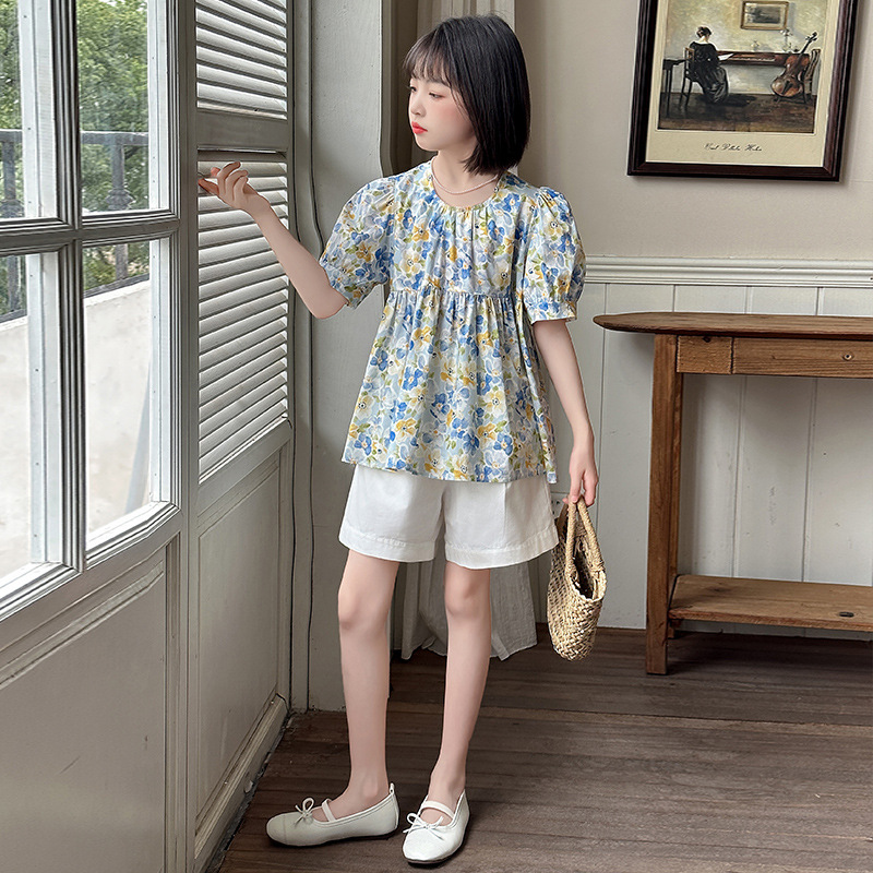 女の子韓国スーツ 2025 夏の新スタイル韓国花柄ベビードールシャツ半袖ショーツクール 2 点セット