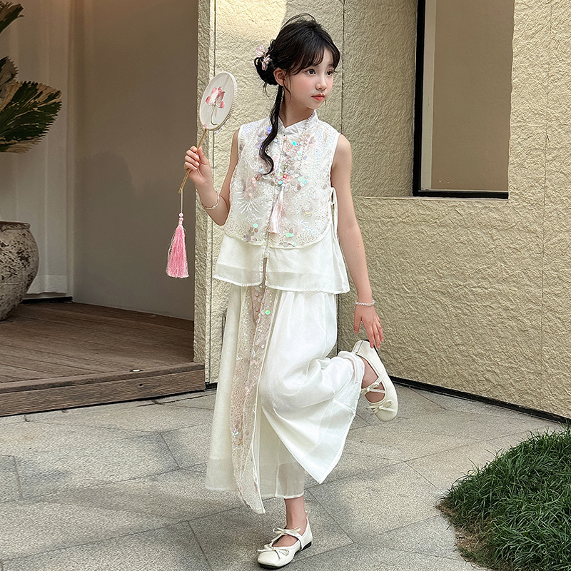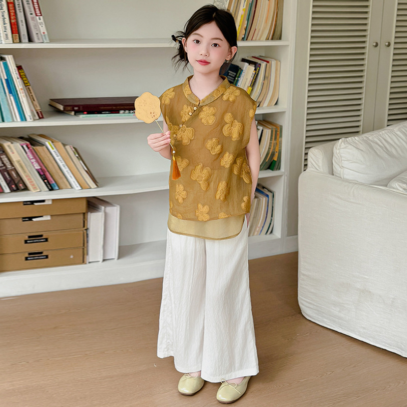 女の子の新しい中国風スーツ 2025 夏の新しい大きな子供の中国風ファッショナブルなワイドレッグパンツ古代風の服 2 点セット