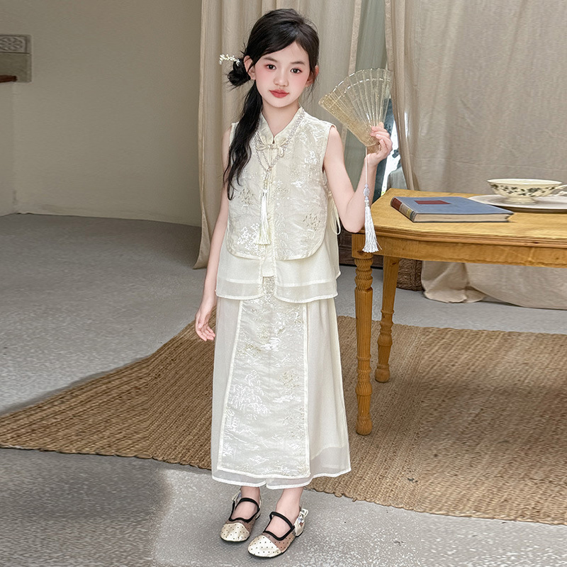 女の子の夏の中国風の新しい中国風のスーツ 2025 新しい大きな子供の古代スタイルの漢服のベストスカートライト高級スーツ